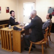 正面に30S「夜詩」オーガさんにいろいろ訊ねています李朝棚の上CATVの取材ですインタビューを受けるオーガさん入って左側の壁面