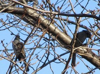冷たい朝です、ヒヨが1羽、追うようにしてまた1羽桜木に止まりました、あまり歓迎しない鳥でも2羽いると可愛いです。
