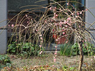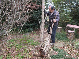 昨年枯れたサンシュウの木が残っていました。枯れているのに自立しているのは太い蔓が支えていたのです。その蔓を切って引っ張り出します。