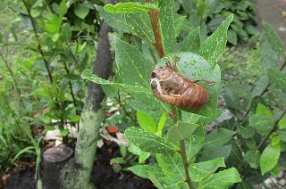 小さな蕾が付いた木槿を挿していたら白く膨らんできました、ギャラリー裏庭では空蝉が、