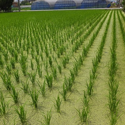 朝のうちは頂上が観えていた石鎚山です。 気になっていた用水路壁の雑草を抜きました。草の丈が伸びると見るだけで暑苦しいですからね。北側の路沿いもさっと抜きます。汗が滝のように出るので水分補給も怠りなく気を付けました。「老夫婦、庭の作業中に熱中症で倒れる!」なんて新聞の見出しにならないように切り上げました。 隣の田圃には浮き草がびっしり繁茂しています。