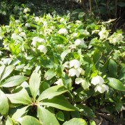 隙間から芽を出し花を付けたスミレ、鳴子百合も葉をひろげ始めてクリスマスローズは盛りです。