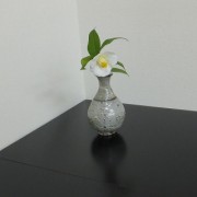 今治のOさんが持って来てくださった貝母、店主が好きで庭に植えた篤山椿、ずっと以前にいただいた一重のヤマブキ、ギャラリーの一隅で頑張っています。
