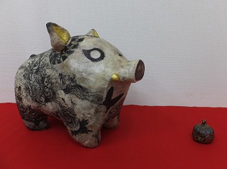 ギャラリー正面には松田正平の書を掛けています。安倍安人さんの戌香合と大場咲子さんの張子「INOGAMI」の干支おくり。何とも可愛い!窯焚き中の安人さんから歳末挨拶の電話がありました!来る歳も宜しく!