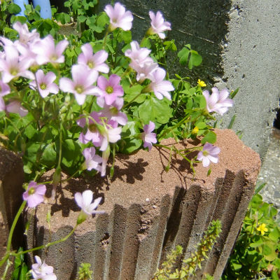 アーケードを出て郵便局への途中は陽がよく当たります。この季節に定番の紫カタバミと黄色の花のカタバミ、この数年ものすごい勢いで伝播したナガミヒナゲシ、我が家にも生えています。