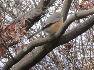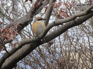 ひゅっと枝に止まったのはモズ、久し振りです。何だかぷっくりしています。チュルルチュルルと鳴いていたメジロは鳴きやめました。