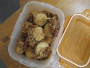 「宇野貴美恵 藍染展」のときにR子さんから店主たち3人におにぎり弁当の差し入れがありました。店主は事務室で先に一人でいただきました。タッパーに3人分あり茶色のものを箸で口にすると、おぉー何とホタテです。もぐもぐしながらタッパーの中を見ると店主が口にしているものより大きいホタテが2個ありました。しまったぁ~よく見るのだったぁ~ お客様が引いて貴美恵さんとウチノカミサンがテーブルでいただきました。その二人に大きなホタテを店主に分けてくれる気はないか尋ねると即、「ない!」 R子さんにそのくだりをいじいじ訴えました。R子さんがあれは冷凍だったから本物を食べさせておかなくちゃと大枚を叩いて殻付きのホタテを煮て持って来てくれたのです。美味しかった!貴美恵さんにはこのことを言わないでおこうっと、フッフッフ…