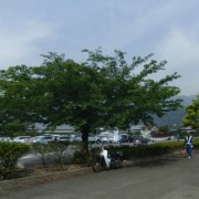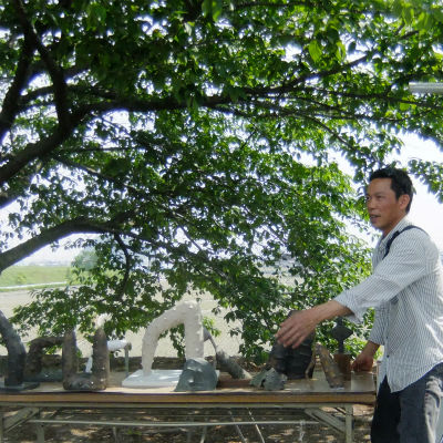 駐車場の一角にベトナム人彫刻家ダム・ダン・ライさんの公開制作場があります。今月末には完成予定とのこと。「迷宮」とタイトルのある作品に開けられた穴から何時もと違った周桑平野が覗けます。