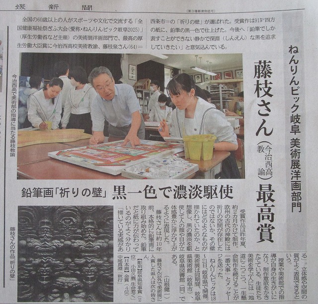晴れているけど今夜から雨、 雨の秋祭りになるのかなぁ~、 ギャラリー前庭の高砂百合、 「関西万博2025」も昨日で閉幕、 今朝の愛媛新聞に藤枝先生が紹介されていました、 「ねんりんピック岐阜」の美術展洋画部門で最高賞の厚生労働大臣賞を受賞されました! 中西良さんは「鎌倉ドゥローイング・ギャラリー」で展示会中、19日まで、 戸田浩二さんは阿曾美術さんで明日から20日まで、