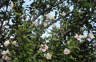 雲は流れ、この時期に沢山咲く木槿、小さなスミレの狂い咲き、