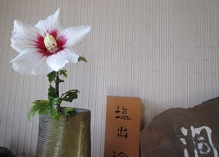 安人さんの花入れに挿していた小さな蕾だった木槿が咲く、