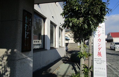 「ナンダカンダ展」の立看板に冬の陽射し、