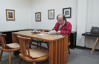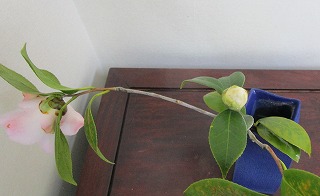 ギャラリー裏庭の赤い椿が覗いている、