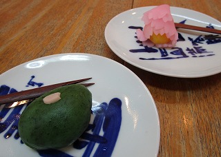 頂いた茶菓子、桜の花びらが一枚、