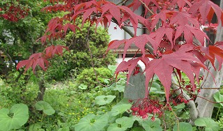 楓には花、侘助の艶やかな葉に出遅れた花、