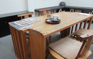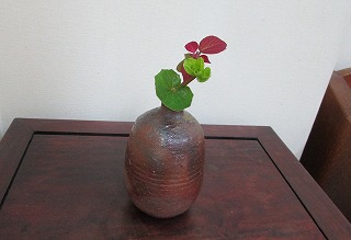 ツワブキ、アジサイ、アカメガシワの若い芽を安人さんの徳利に挿し、