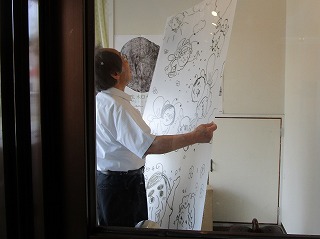 青空も覗いている、 ギャラリーの何時ものところで元気に鳴く雀、 入口にある店主のチエリ絵は「零駒無蔵展」のあいだ2Fへ移動、 早速、FBに載せます、 明日は掃除だけをします、 「ごきげんな人々」がご来廊お待ちしています!
