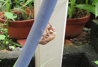 ギャラリー裏庭へ出てヒオウギを剪って竹籠に挿します、裏庭にも空蝉が観られるころ、