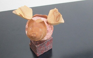 「零駒展」2度目のご来廊になるKさんはこの「ハッピグ」がお気に入り、次回は早く来てこれを予約すると宣言!